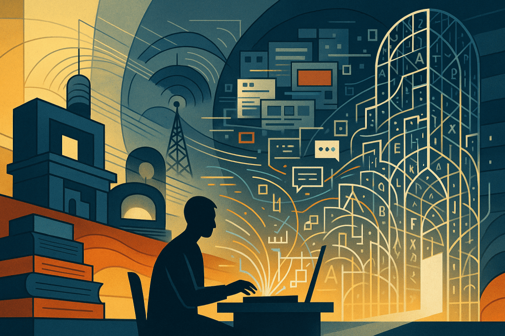History has a habit of rearranging the human voice. The printing press stretched it across continents; broadcast media synchronized it into shared moments; the early internet—where I learned digital literacy by accidentally downloading seventeen toolbars—fractured it into millions of competing monologues. Each shift expanded who could speak and how far their words could travel. Now artificial intelligence arrives, not as another convenience, but as a new architecture for expression itself.